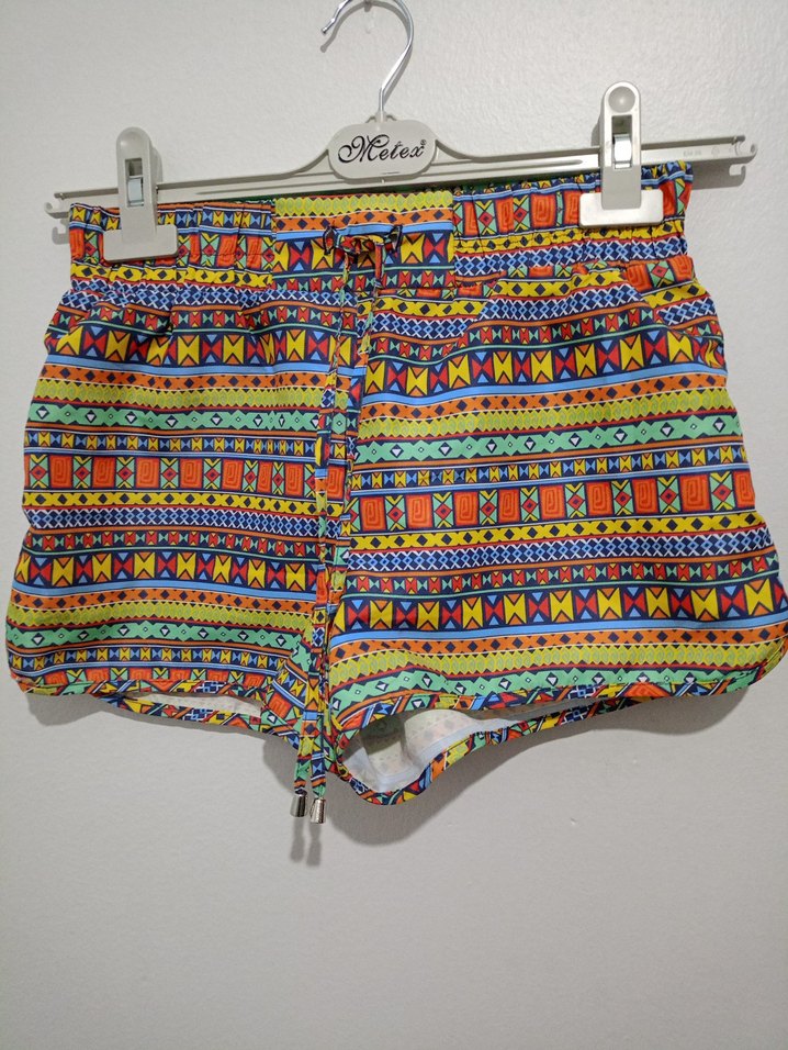 Renkli bohem desenli, elastik bel bantlı, kısa ve dar kesim mini şort. Plaj için uygundur.
