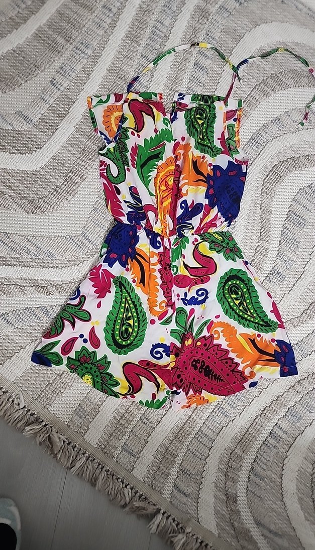 Renkli bohem tarzda, askılı ve dantel detaylı, kısa ve vücuda oturan mini tulum, parti için uygun.