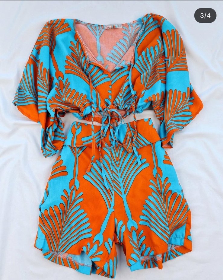 Renkli bohem mini tulum, bol kesim ve V yaka ile. Askılı kollu ve drapeli tasarım, günlük kullanım için uygundur.