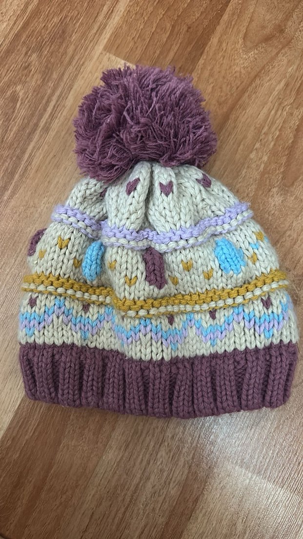 Yumuşak iplikten örülmüş, renkli ve bohem tarzda bebek bere. Üstünde büyük ponpon ve çok renkli desenler bulunur. Rahat ve retro görünümlü.