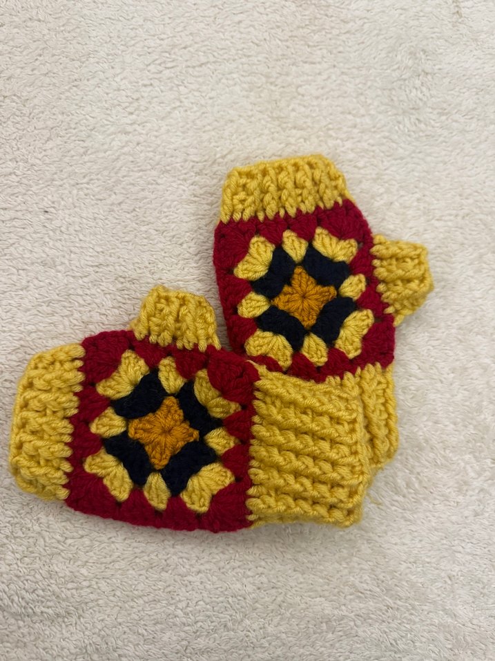 Renkli, örgü bohem tarzda eldivenler. Canlı çok renkli, rahat ve retro tasarıma sahip.