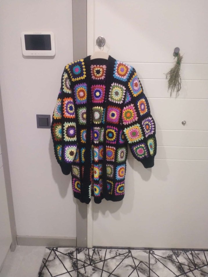 Renkli desenli, uzun kollu, midi boy ve bol kesim örgü hırka, bohem tarzı için ideal bir rahatlık sunar.