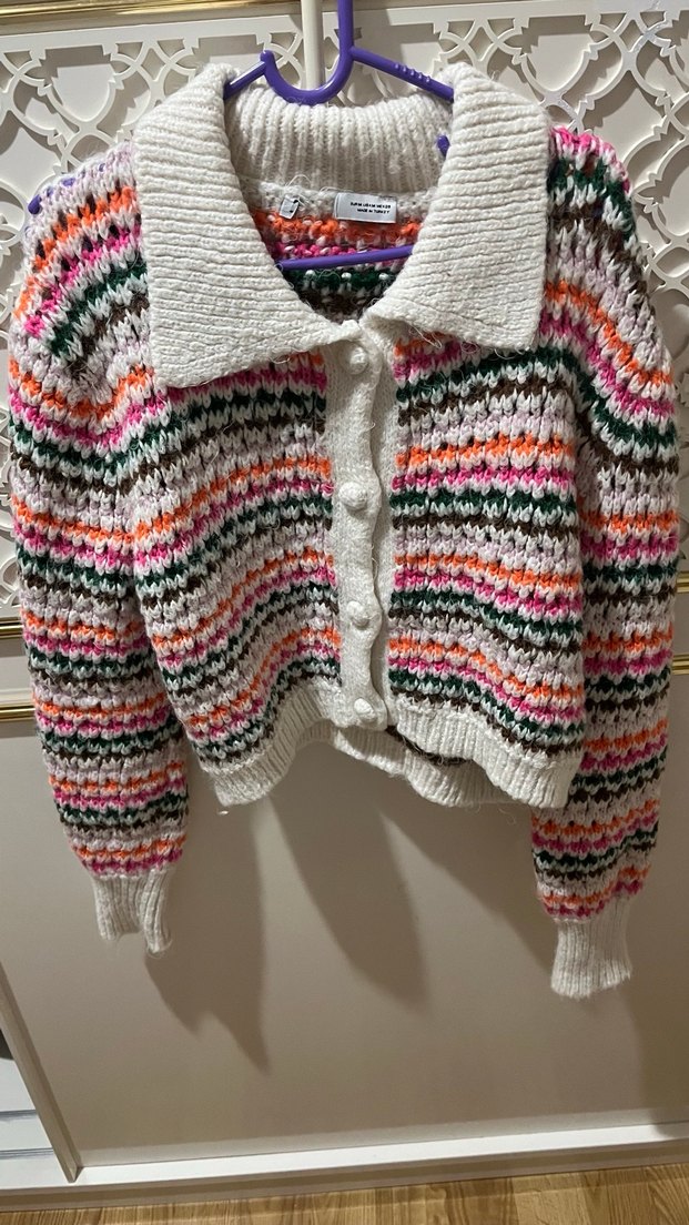 Örgü kumaştan yapılmış, yakalı ve uzun kollu, bol kesim bohem tarzda, pastel tonlarda batik desenli gündelik kullanıma uygun hırka. Sorunsuzdur bir iki kere giyildi kazak yada ceket olarak giyilebilir
