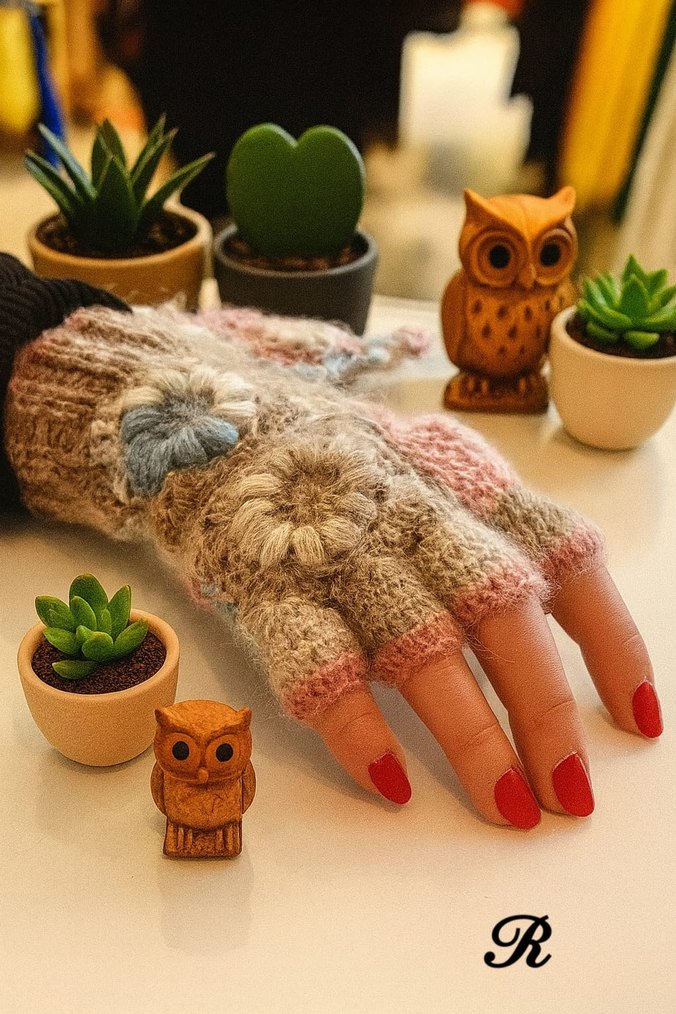 Pastel çok renkli, örgü bohem tarzda kadın parmaksız eldivenler.