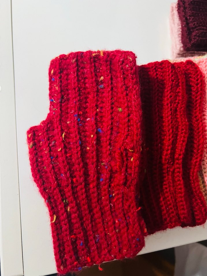 Bu renkli kırmızı örgü eldivenler, bohem tarzıyla sıcak ve dokulu bir yapıya sahiptir. Parmaksız tasarımıyla retro ve hippie havası verir.