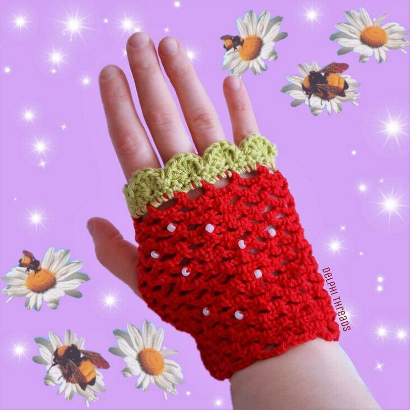 Kırmızı gövde ve açık yeşil dalgalı kenarlarla renkli örgü kadın eldiveni. Bohem tarzda, rahat ve retro bir görünüm sunar.
