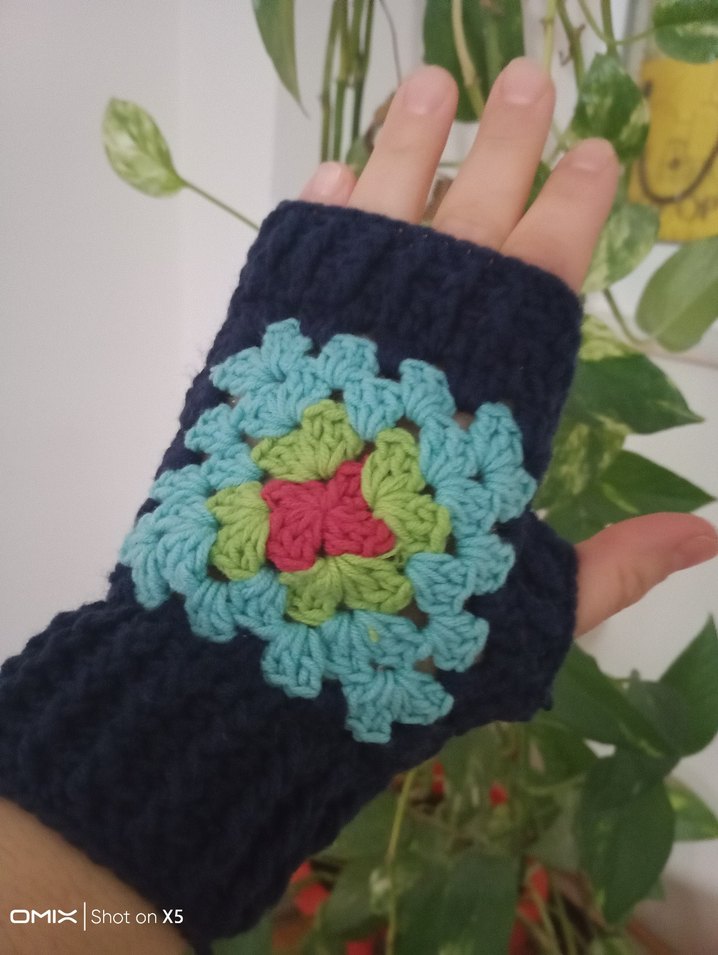 Canlı çiçek desenli, renkli örgü bohem tarzı kadın eldiveni, sıcak ve retro bir görünüm için uygun.