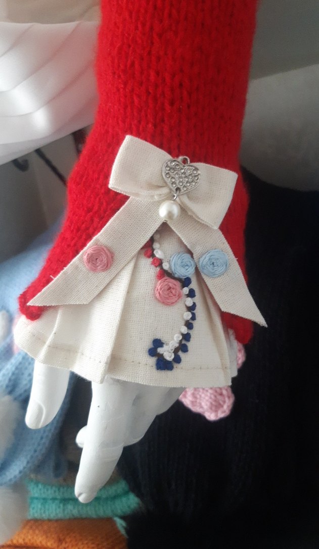 Çiçek nakışlı, fiyonklu ve aksesuar detaylı bohem tarzı renkli örgü kadın eldiveni. Yumuşak örgü kumaştan üretilmiştir.