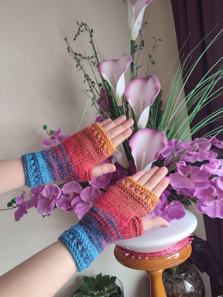 Yumuşak örgü kumaştan yapılmış, parmakları açık renkli bohem tarzı kadın eldiveni. Rahat ve canlı, retro görünüme uygun.