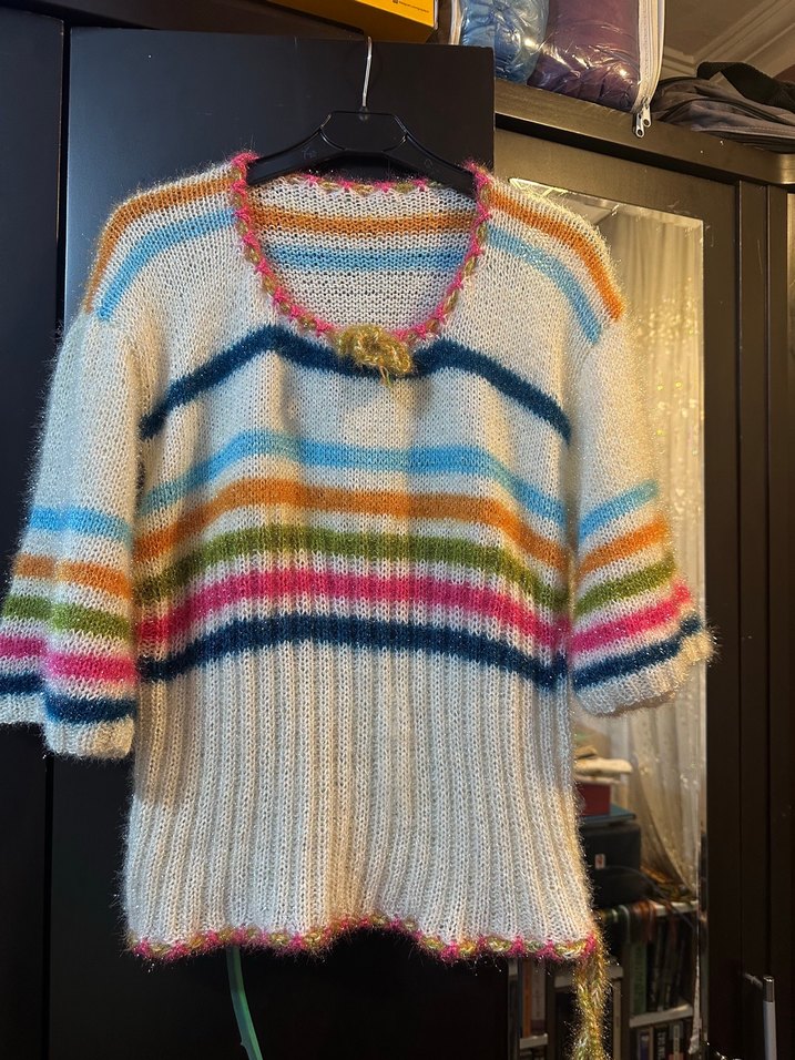 Yumuşak örgüden yapılmış, bol kesim, bisiklet yaka ve yarım kollu kadın kazak. Hafif çok renkli çizgilerle bohem ve rahat bir stil sunar.
