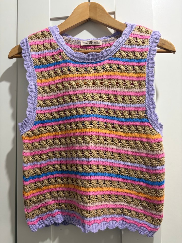 Renkli örgü desene sahip, bohem tarzda, yuvarlak yaka, kolsuz, bol kesim kadın süveter. Hiç kullanılmadı.