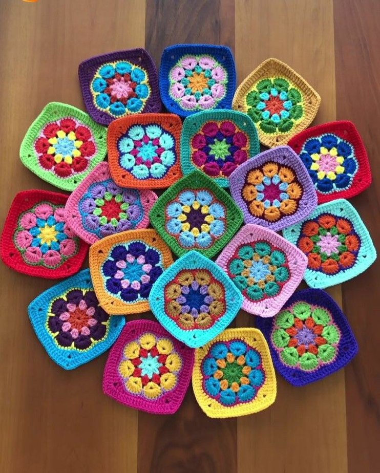 Canlı renklerde çiçek desenli bohem tarzı renkli örgü kare motifler. El işleri için uygundur. Adet fiyatı 20 tldir