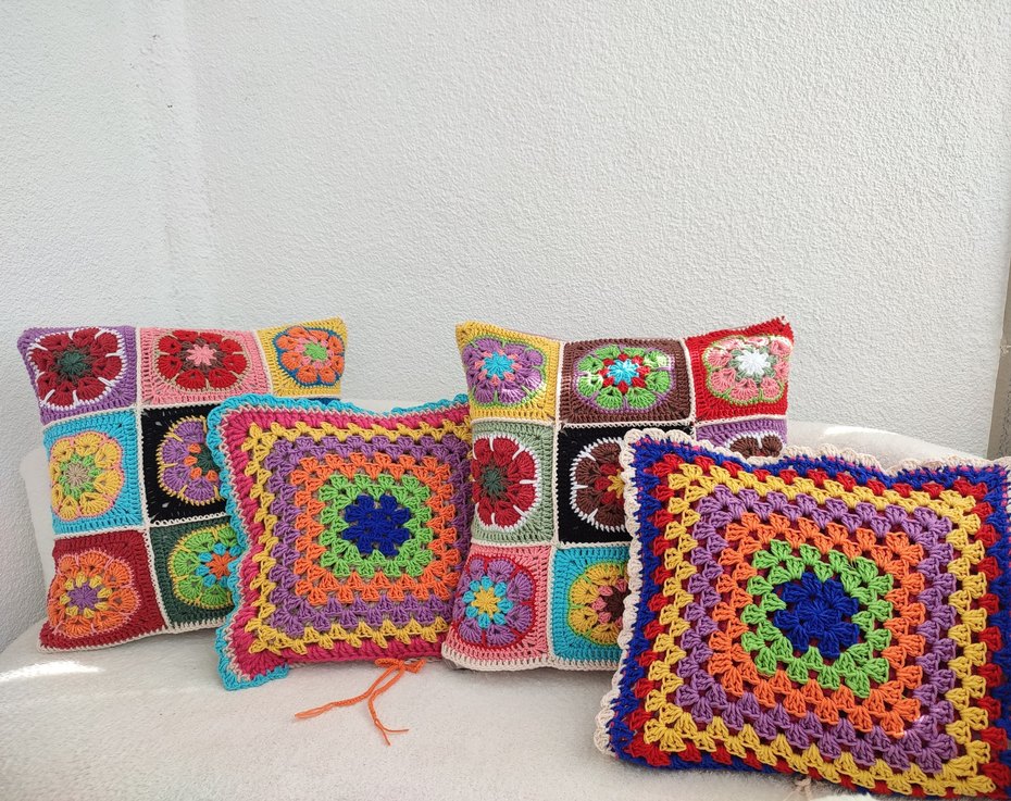 Canlı desenli renkli bohem örgü kırlent kılıfları. El yapımı tasarımıyla her mekâna hareket katar.