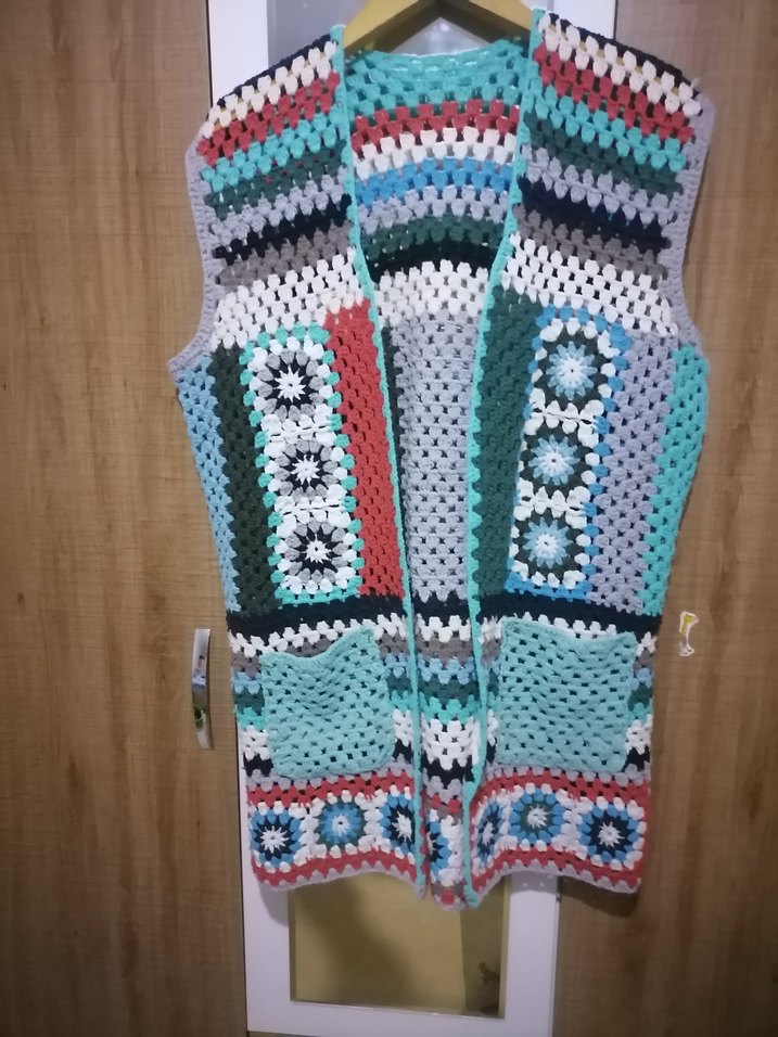 Renkli desenli örgü, kolsuz, bol kesim ve uzun boy bohem tarzda hırka. Yüksek yaka ve iki ön cepli.