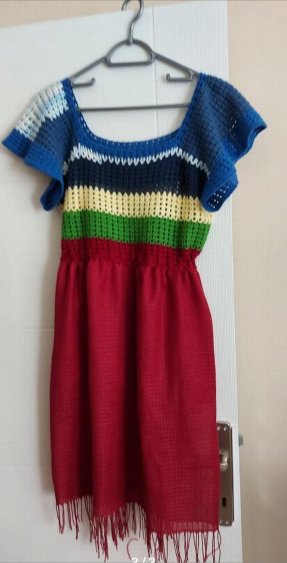 Renkli, bohem tarzda örgü mini elbise. Salaş kesim, tekne yakalı ve askılı kollu, günlük kullanıma uygun.