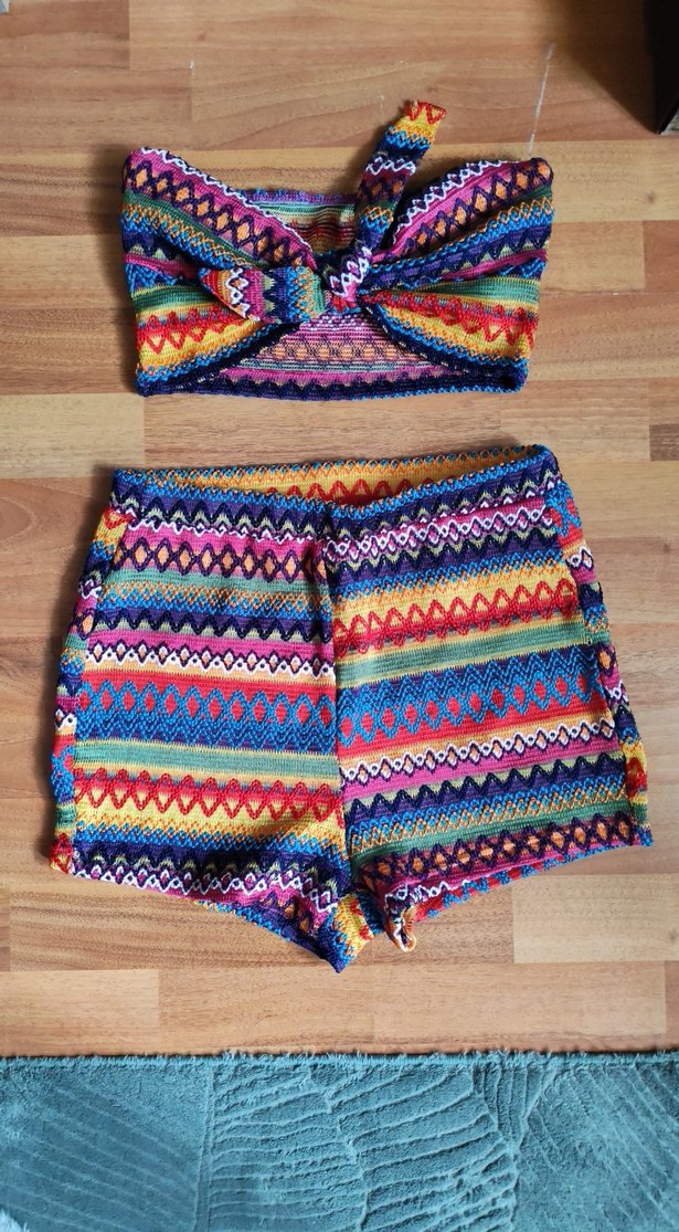 Renkli örgü dokulu, bohem desenli, rahat mini şort, bol ve rahat krop, dış mekanlar için ve tatil bölgelerinde kullanmak için uygundur.