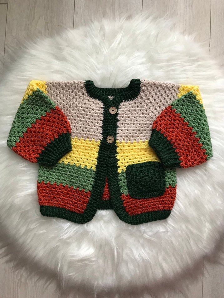 Renkli, bohem tarzda örülmüş uzun kollu, yuvarlak yaka, bol kesim hırka. Ahşap düğmeli ve küçük ön cepli.Akrilik iplerle örülmüştür.Kışın sıcacık tutar.5-6 yaş erkek bebekler için uygundur.Ölçüleri İstenirse fotoğraflara eklerim. #erkekbebekhırkası #yeşil #sarı #krem