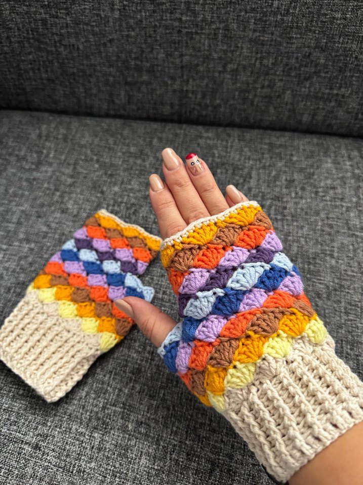 Yumuşak örgüden yapılmış, renkli, bohem tarzda parmaksız kadın eldivenleri. Retro ve hippie tarzına uygun sıcak tutar.