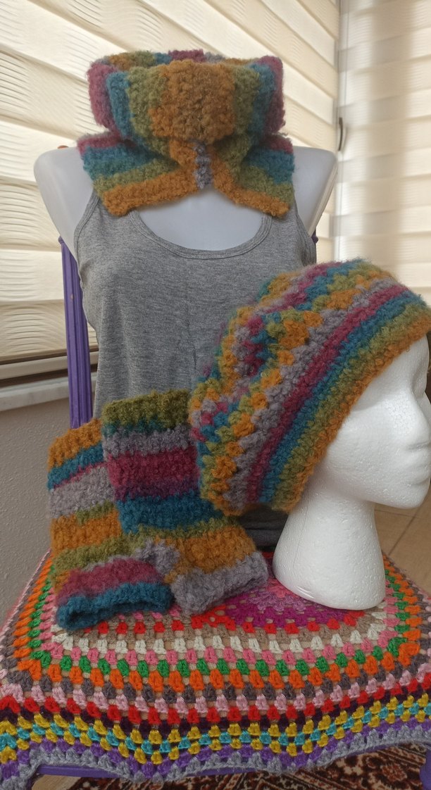 Renkli çizgili desenli bohem ressam şaopkası ve boyunluk eldiven seti, yumuşacık el örgüsü