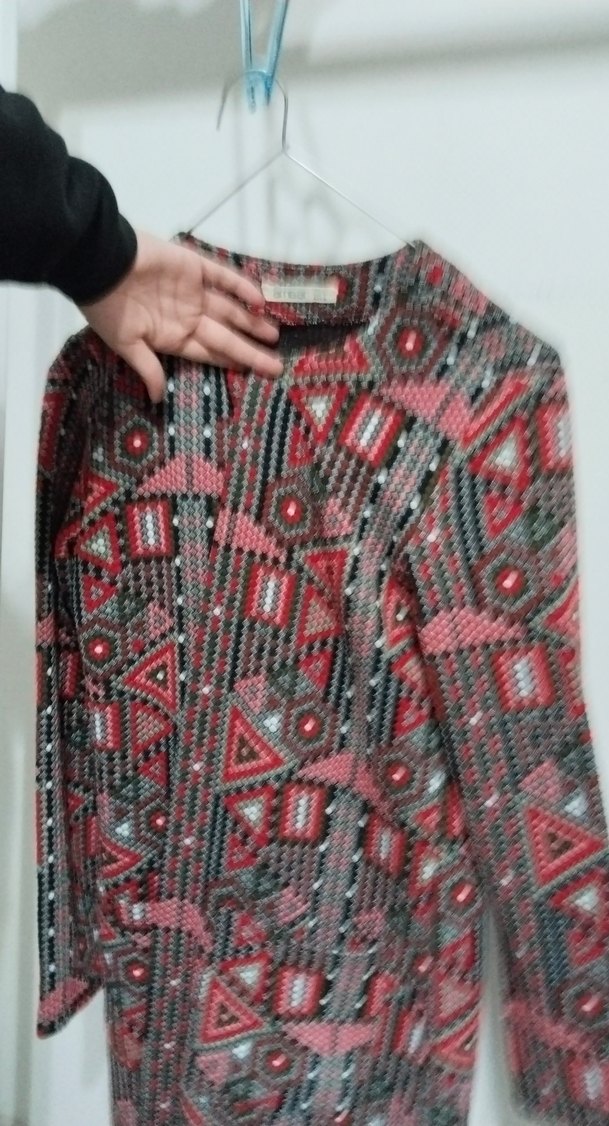 Bu uzun hamile ceketi, bol kesim, yuvarlak yaka ve uzun kolludur. Renkli desenli, örgü dokulu tekstilden yapılmış olup bohem tarzını yansıtır.