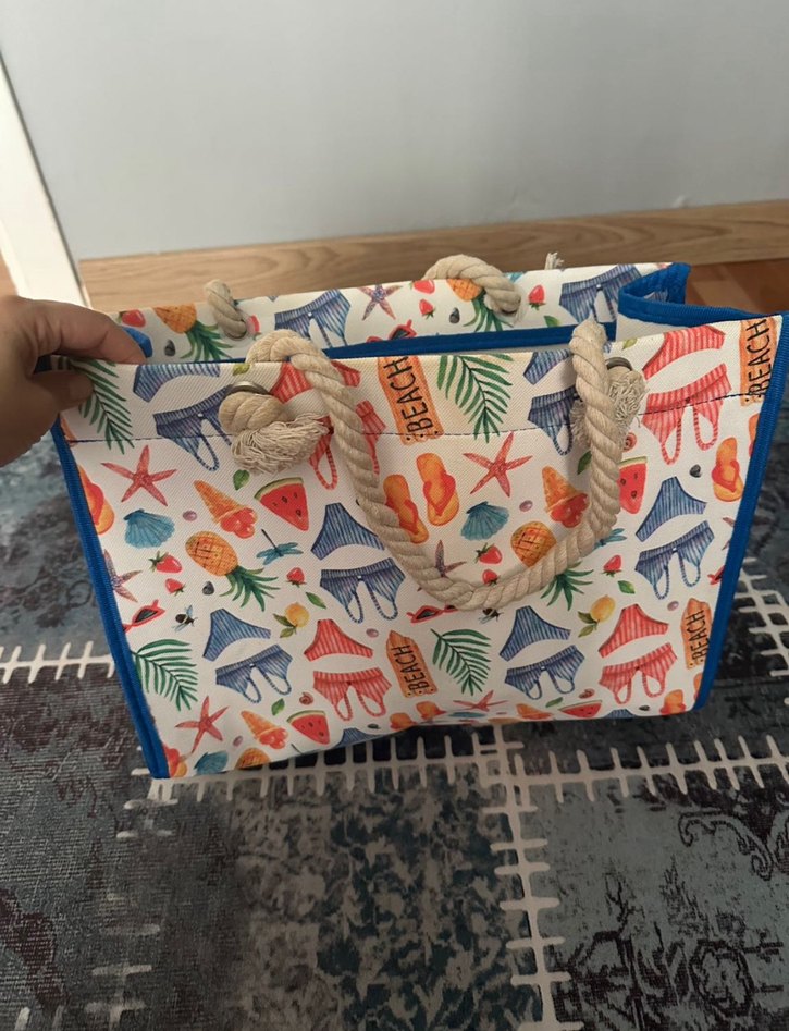 Bu renkli bohem plaj çantası baskılı desenli, sentetik kumaştan yapılmıştır. Halat saplı ve Plaj için uygundur. ️