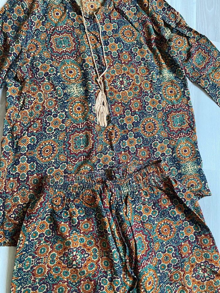 Renkli bohem püsküllü mini tunik, bol kesim, uzun kollu ve V yaka detayına sahiptir. Canlı batik desenli tekstil kumaştan yapılmıştır, günlük kullanım için uygundur.