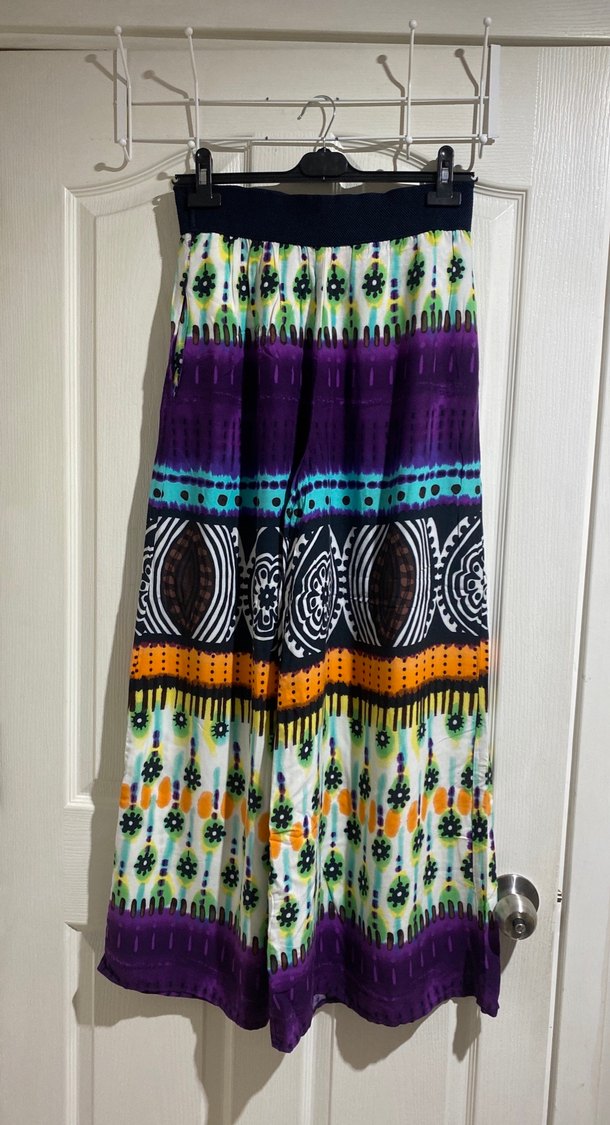 Uzun, renkli ve salaş kesim kadın pantolon, pilili yapısı ve canlı batik deseniyle bohem tarzı yansıtıyor.