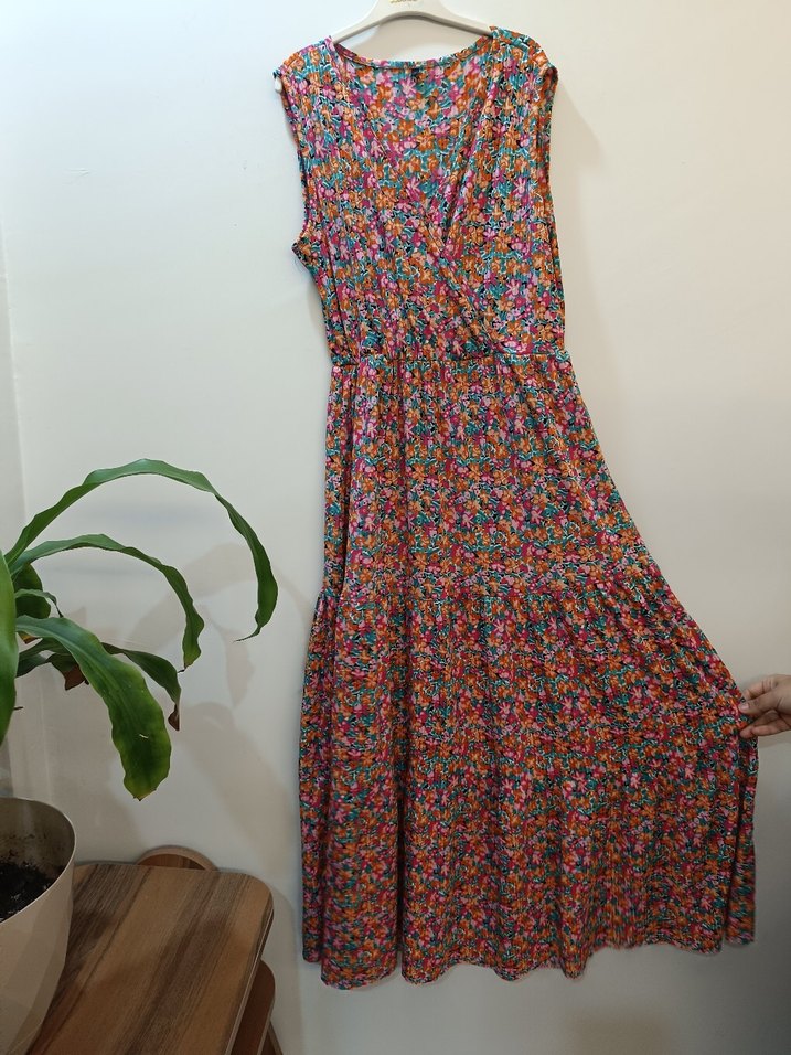 Kolsuz, uzun boy renkli tie-dye desenli, drapeli ve salaş kesim bohem elbisedir. V yakalı ve yumuşak sentetik kumaştan yapılmıştır, dış mekan için uygundur. sayılı kullanıldı tertemiz yepyeni marka temsili