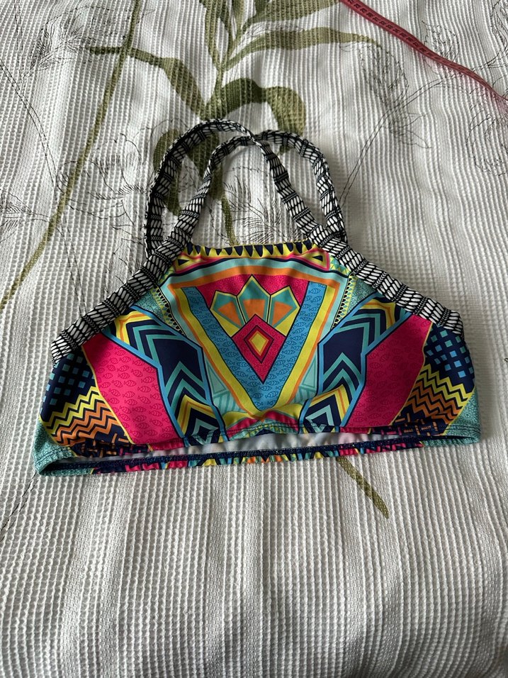 Renkli tie-dye desenli, fermuarlı, ince askılı ve vücuda oturan bohem tarzda spor bikini üstü. Kısa kesimiyle retro ve hippie havası verir.
