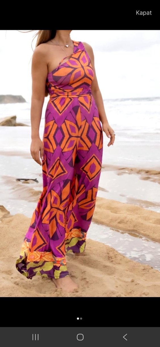 Renkli bohem tarzda, straplez yaka ve askılı kollara sahip, bol kesim ve drapeli uzun elbise. Canlı tie-dye desenli, sentetik kumaştan, açık hava kullanımı için uygun.