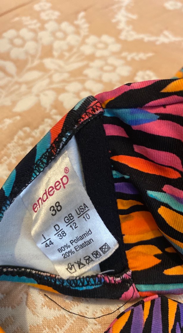 koyu tie-dye desenine sahip olup, yumuşak poliamid ve elastan karışımından üretilmiştir. beden 38, endeep markası.