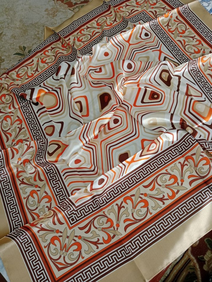 Renkli ve yeni eşarp, bohem ve retro desenlerle konvansiyonel tarzda, drapeli şekilde tasarlanmıştır.