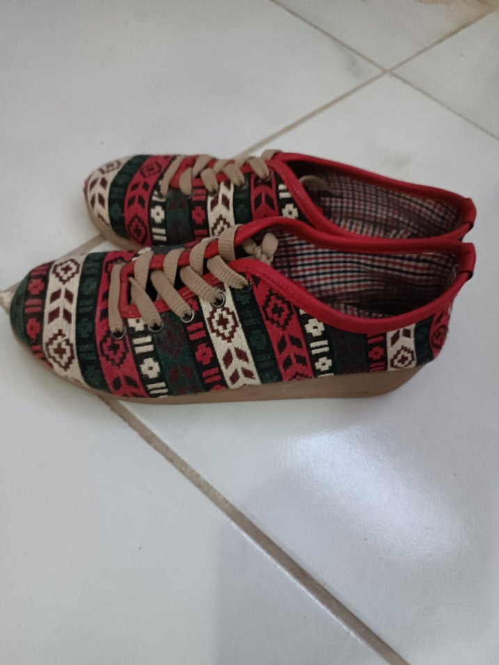 Renkli, bohem desenli,kilim desenli kadın babet ayakkabı dolgu topuklu ve tokalı tasarıma sahip, rahat Bir kaç kez kullanılmıştır temizdir.