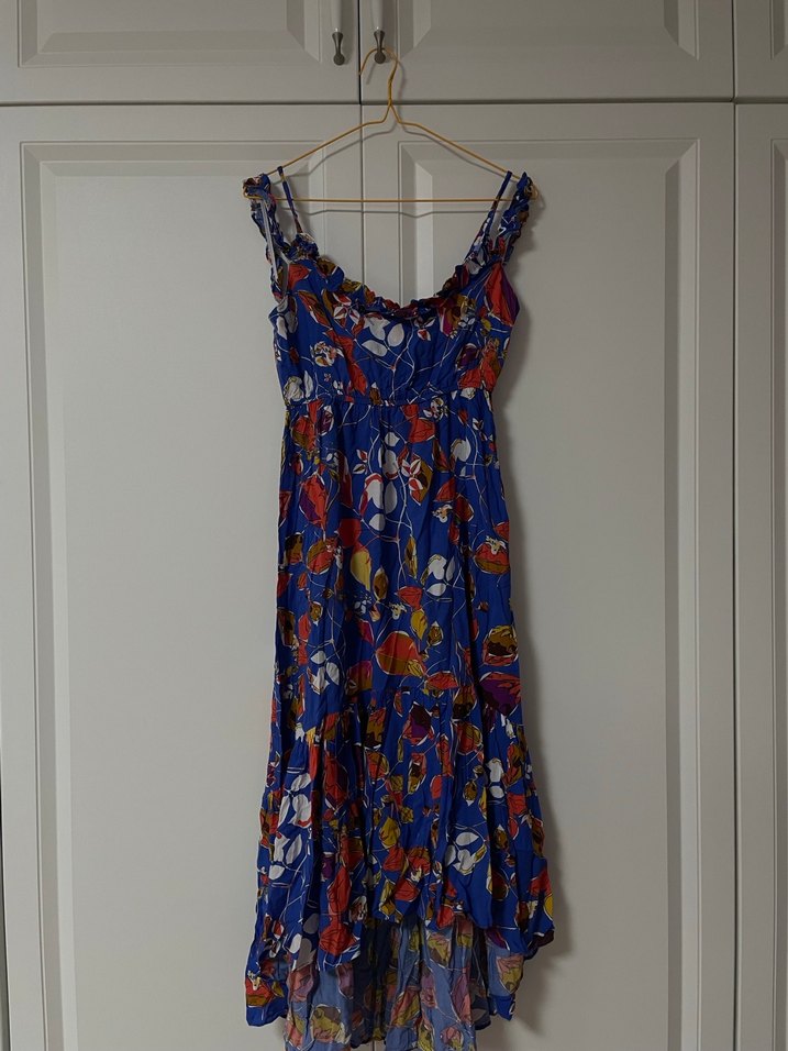 Renkli, bol kesim, askısız yaka ve etrk kısmı fıffır detaylara sahip bohem elbise, yumuşak tekstil kumaştan yapılmıştır.