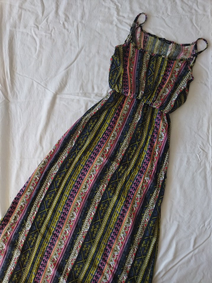 Renkli bohem uzun elbise, askılı ve kayık yaka.