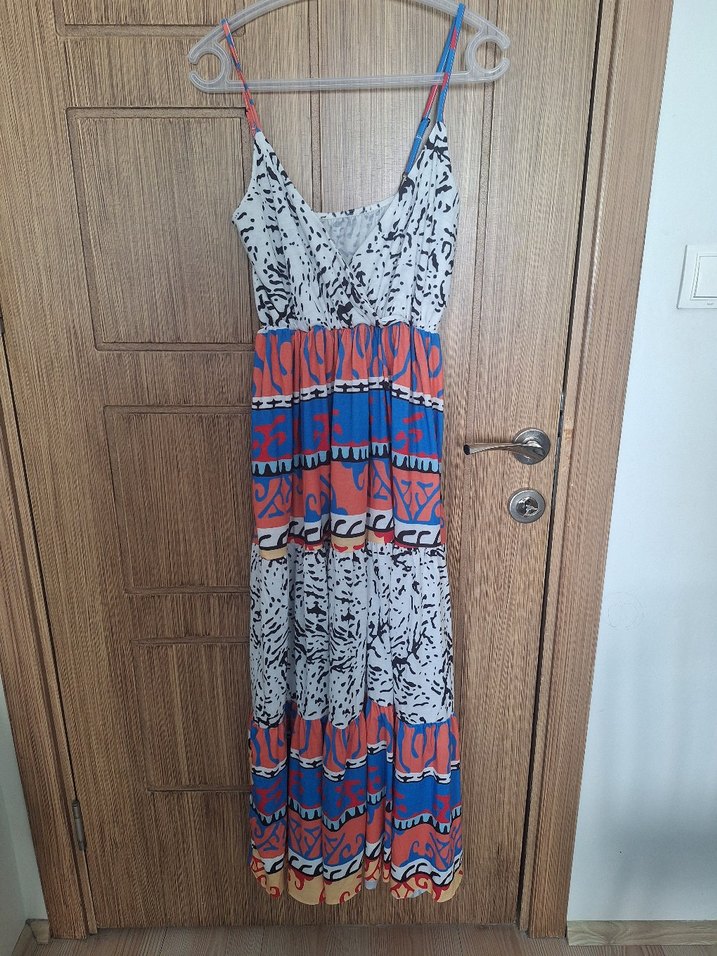 Renkli bohem uzun elbise, askılı ve bol kesimlidir. Canlı batik desenlere ve pileli detaylara sahiptir, günlük kullanım için uygundur. s m beden uyumludur 70 kilo 1.70 de boyum benim bileklerime geliyor istenirse terzide boyu ayarlanabilir sadece 1 kere giyildi marka temsilidir