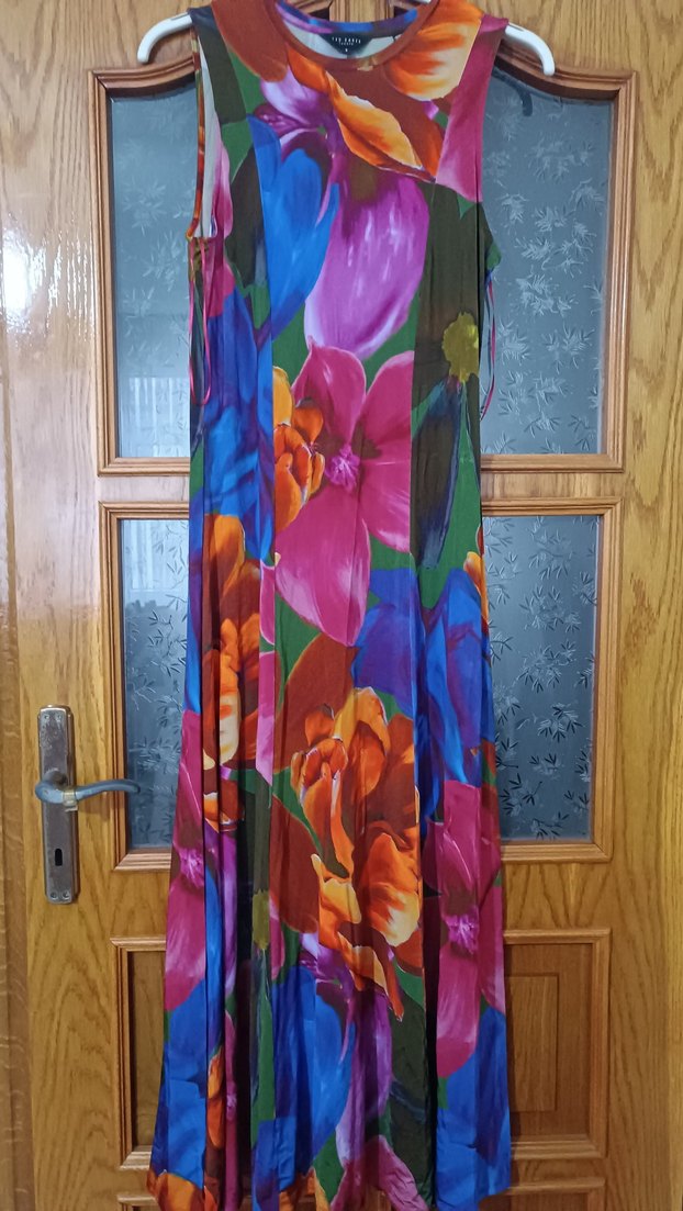 Renkli, askısız, bol kesim uzun elbise, sentetik kumaş ve drapeli bağlama desenli.