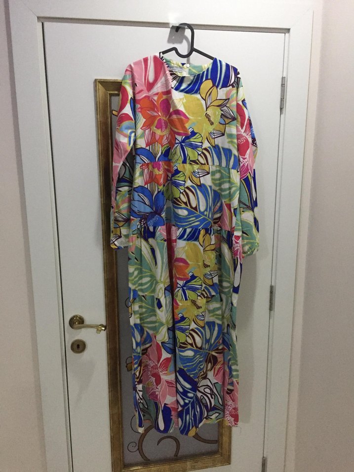 Renkli tie-dye desenli, uzun kollu, bol kesim ve drapeli bohem elbise. Sentetik kumaştan, notched lapel yakalı, günlük kullanıma uygun.