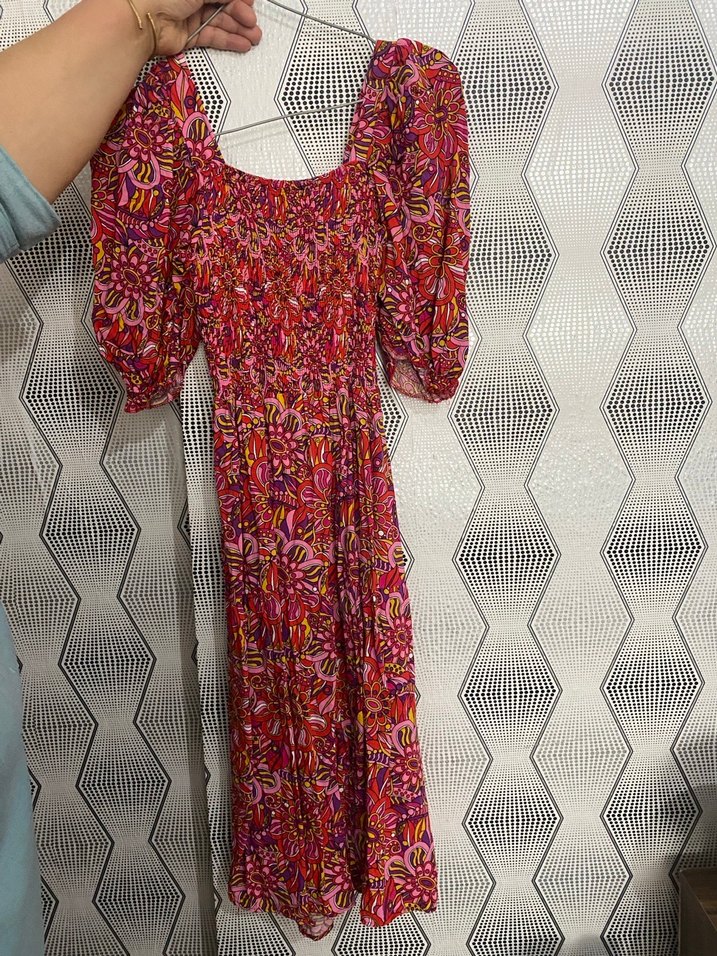 Renkli bohem tarzda, pileli detaylı ve askılı kollu, vücuda oturan uzun elbise.