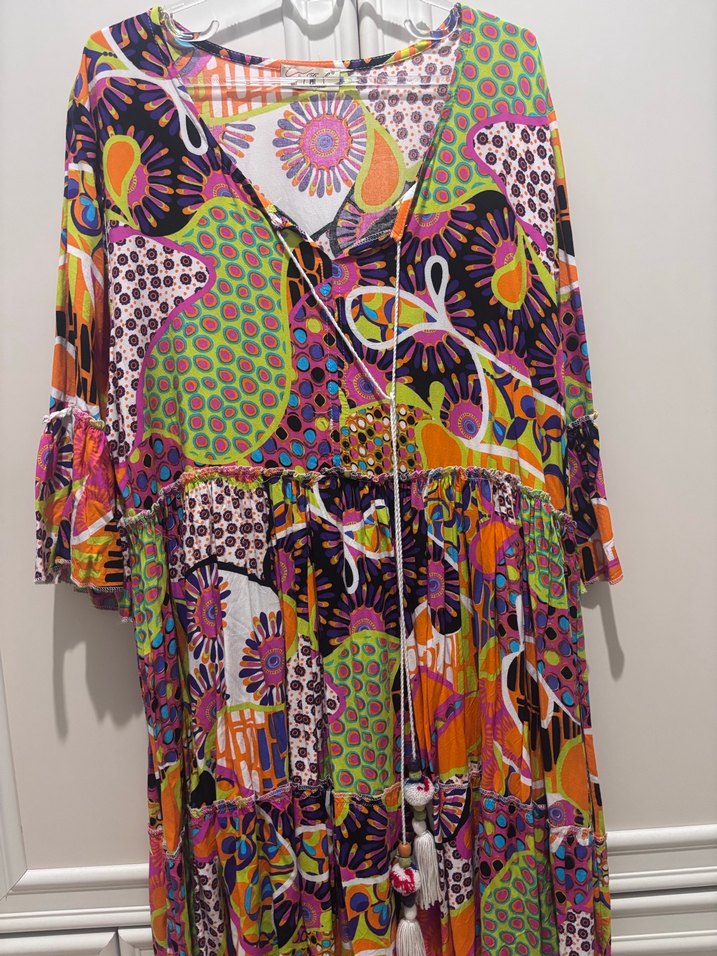 Renkli desenli, uzun kollu, V yakalı, püsküllü bohem tarzda bol kesim uzun elbise. Canlı renkleriyle retro havası taşıyor.