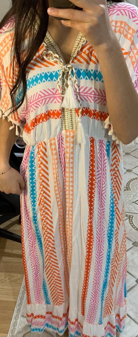 Renkli tie-dye desenli, bol kesim bohem uzun elbise. Tekstil kumaştan, kayık yaka ve askılı kollu, püsküllerle süslenmiştir.