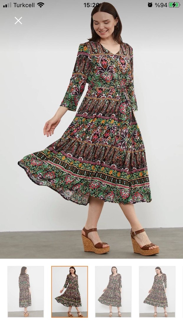 Renkli bohem tarzda, bol kesim, fırfırlı ve V yakalı uzun elbise. Desenli, üç çeyrek kollu, yumuşak sentetik kumaştan günlük kullanıma uygun.