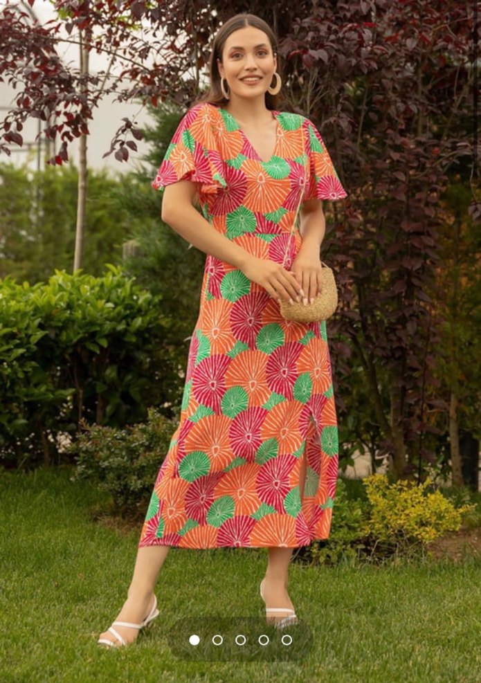 Renkli, V yakalı ve kısa kollu bohem uzun elbise. Sentetik kumaştan, bol kesim ve drapeli tasarımıyla parti için uygun.