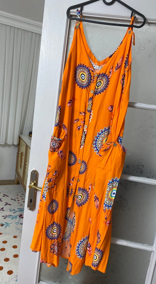 Renkli bohem tarzda, V yakalı, düğmeli ve kolsuz uzun elbise. Rahat kesimi ve canlı batik desenleriyle günlük kullanım için uygun.