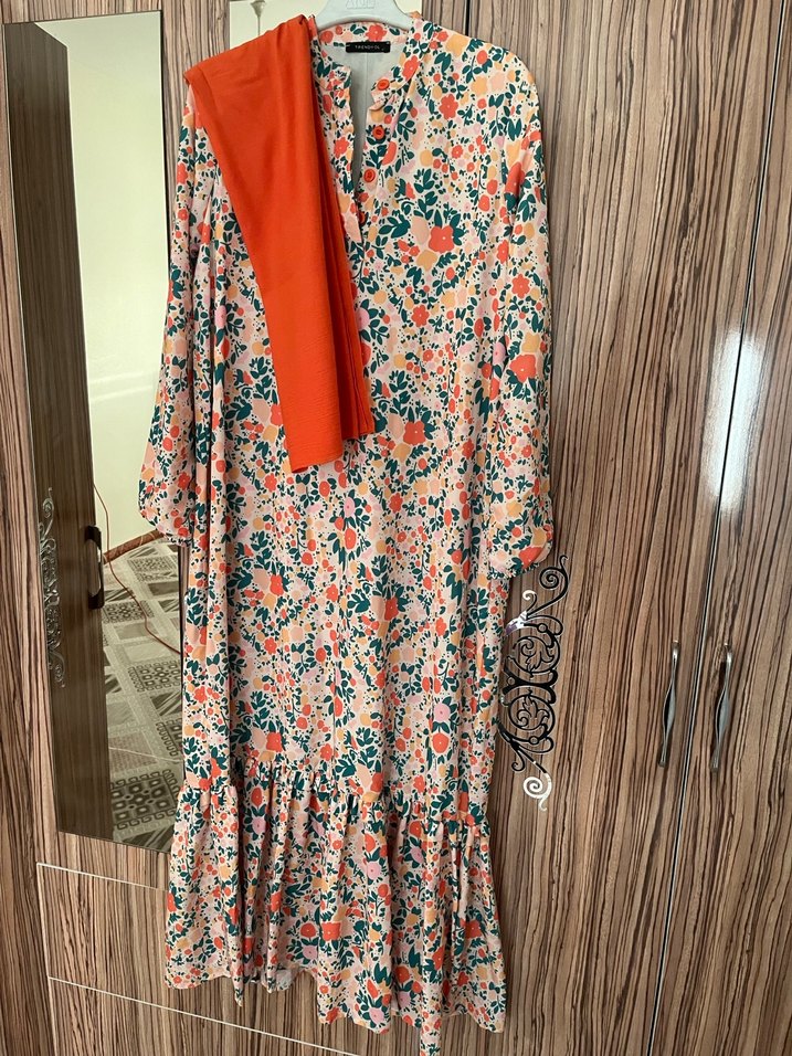Renkli bohem uzun elbise, bol kesim, uzun kollu ve V yakalıdır. Sentetik kumaştan yapılmış, canlı batik desenli ve drapeli tasarıma sahiptir. 1 kere gıyıldı sadece 1 satlıgıne fıyata yardımcı olunur