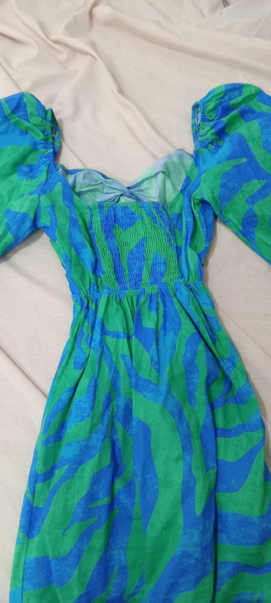 Renkli bohem elbise, V yaka ve fırfır detaylıdır. Askılı kollu, uzun boylu ve açık hava etkinlikleri için uygundur.