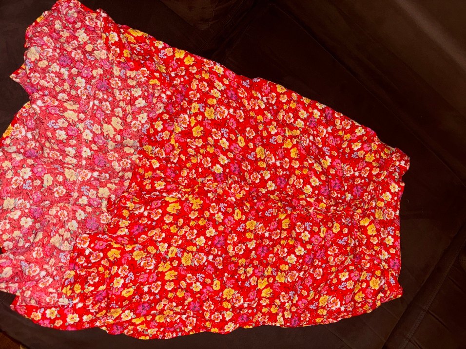Renkli çiçek desenli, bol kesim ve fırfırlı, sentetik kumaştan yapılmış bohem tarzda uzun etek.
