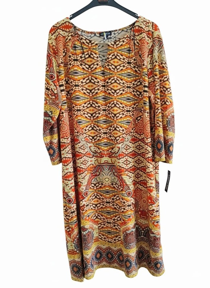 Renkli desenli, uzun kollu ve bol kesim bohem elbise. Drapeli tasarıma ve V yaka detayına sahiptir, günlük kullanım için uygundur. yeni etiketli uygun likralı salaş diz altı yarım kol elbise yurtdışı urunu