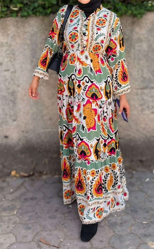 Renkli desenlere sahip, uzun ve bol kesim kadın elbisesi. Uzun kollu ve yuvarlak yaka, boncuk detaylı bohem tarzda.