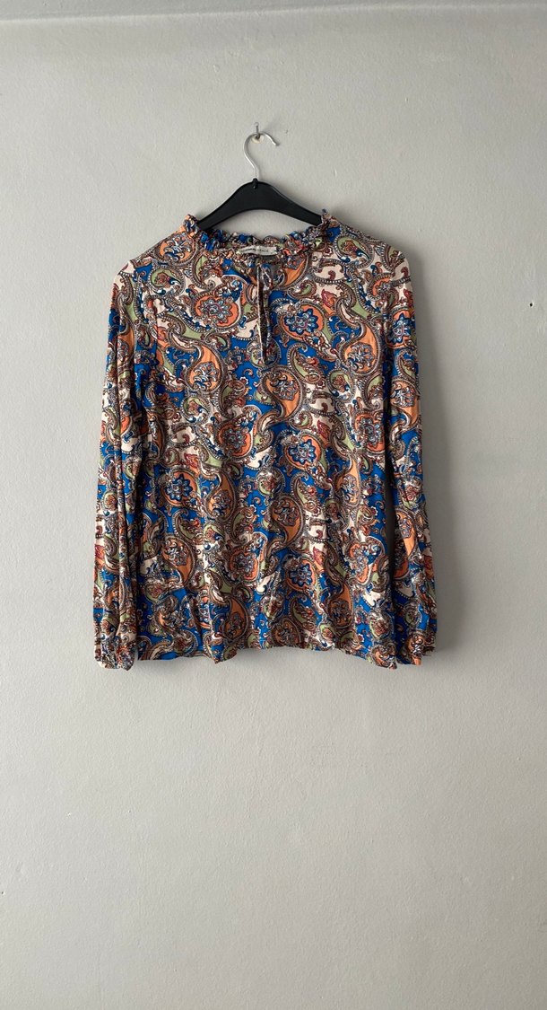 Renkli paisley desenli, , uzun kollu bohem bluz. Yumuşak sentetik kumaştan, bol kesim ve yüksek yakalı, günlük kullanıma uygun.